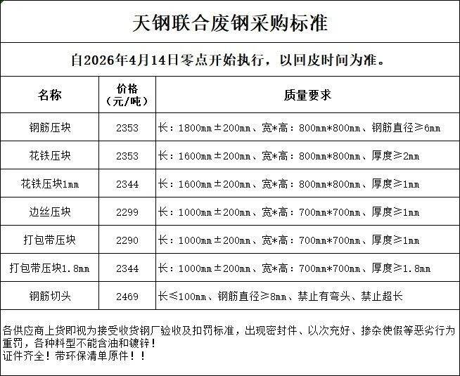 天津大無縫通知,本期廢鋼價(jià)格下調(diào)**元/噸。具體以廠家價(jià)格表為準(zhǔn)。