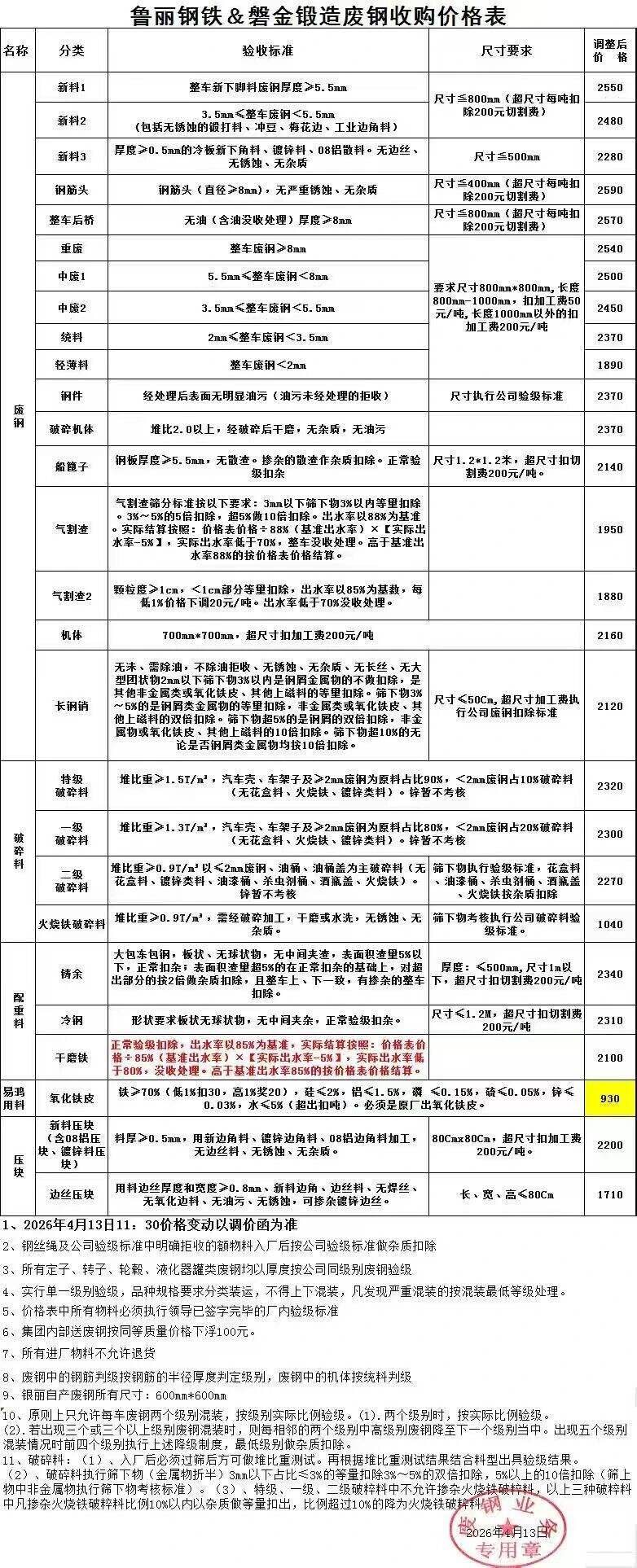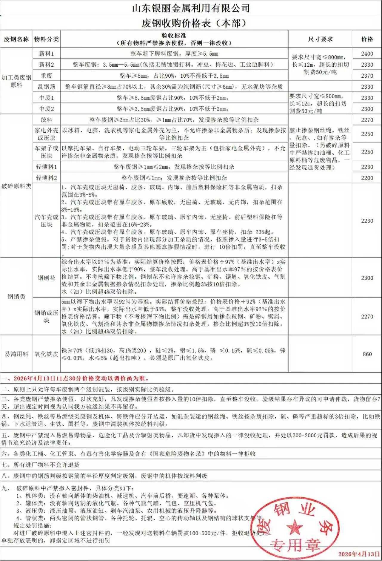 濰坊特鋼廢鋼價格做出如下調(diào)整:不開票散戶----------重型廢鋼:****元/噸,特級廢鋼:****元/噸,中級廢鋼:****元/噸(停收)*%增值稅專用發(fā)票----重型廢鋼:****元/噸,特級廢鋼:****元/噸,中級廢鋼:****元/噸**%增值稅專用發(fā)票---重型廢鋼:****元/噸,特級廢鋼:****元/噸,中級廢鋼:****元/噸廢鋼個人戶----------重型廢鋼:****元/噸,特級廢鋼:****元/噸,中級廢鋼:****元/噸以上規(guī)格及價格自****年*月*日上午*點開始執(zhí)行。