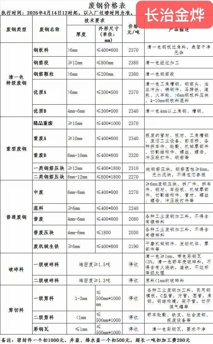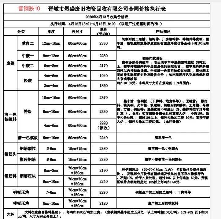 **日山西晉鋼廢鋼跌**,重廢二****,中廢一****,中廢二****,*-*厚輕廢****,清一色**-**厚特級(jí)****,清一色*-**厚特級(jí)****,清一色*-*厚特級(jí)****(停收),清一色模板****,清一色鋼筋顆粒****,*-*厚鋼筋壓塊****,*-**厚鋼筋壓塊****,鋼板壓塊****模板壓塊****,不含稅。