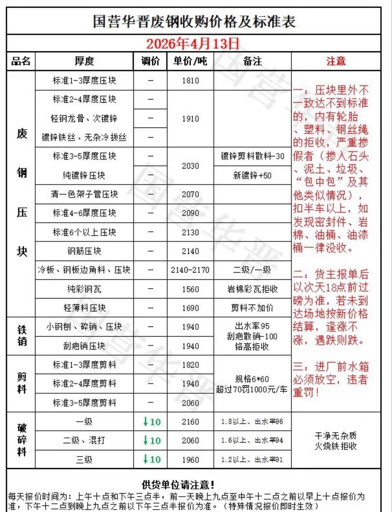 ****年*月**日山西國營華晉廢鋼收購價格及標(biāo)準(zhǔn)表