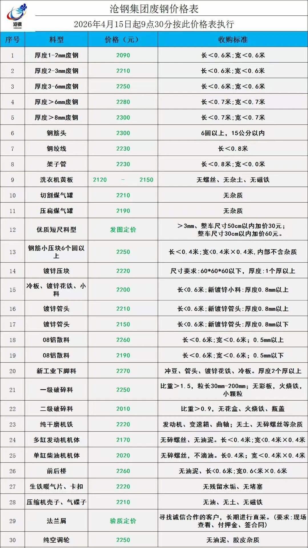 滄鋼通知:****年*月**日*:**起廢鋼價(jià)格下調(diào)**元。