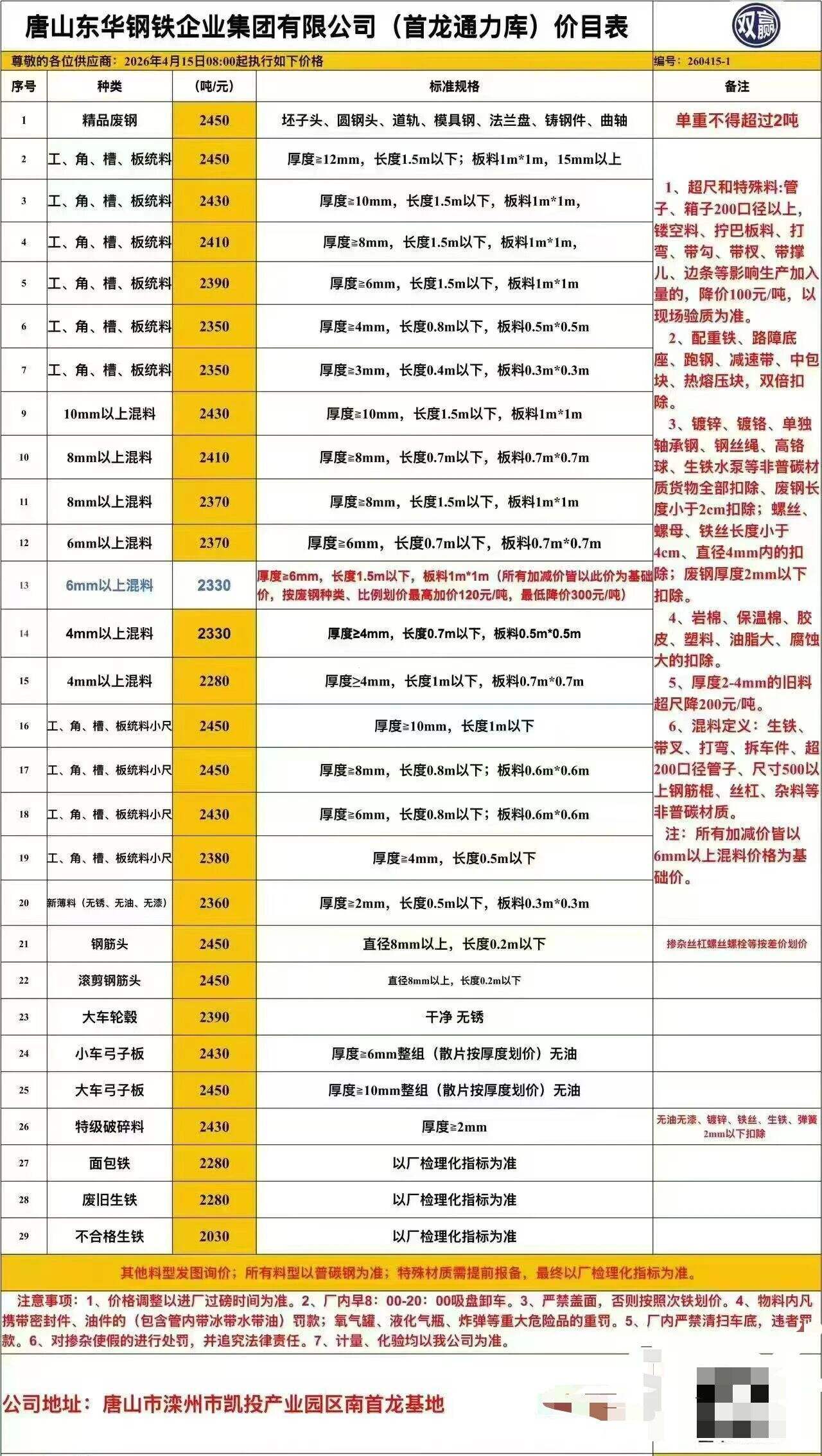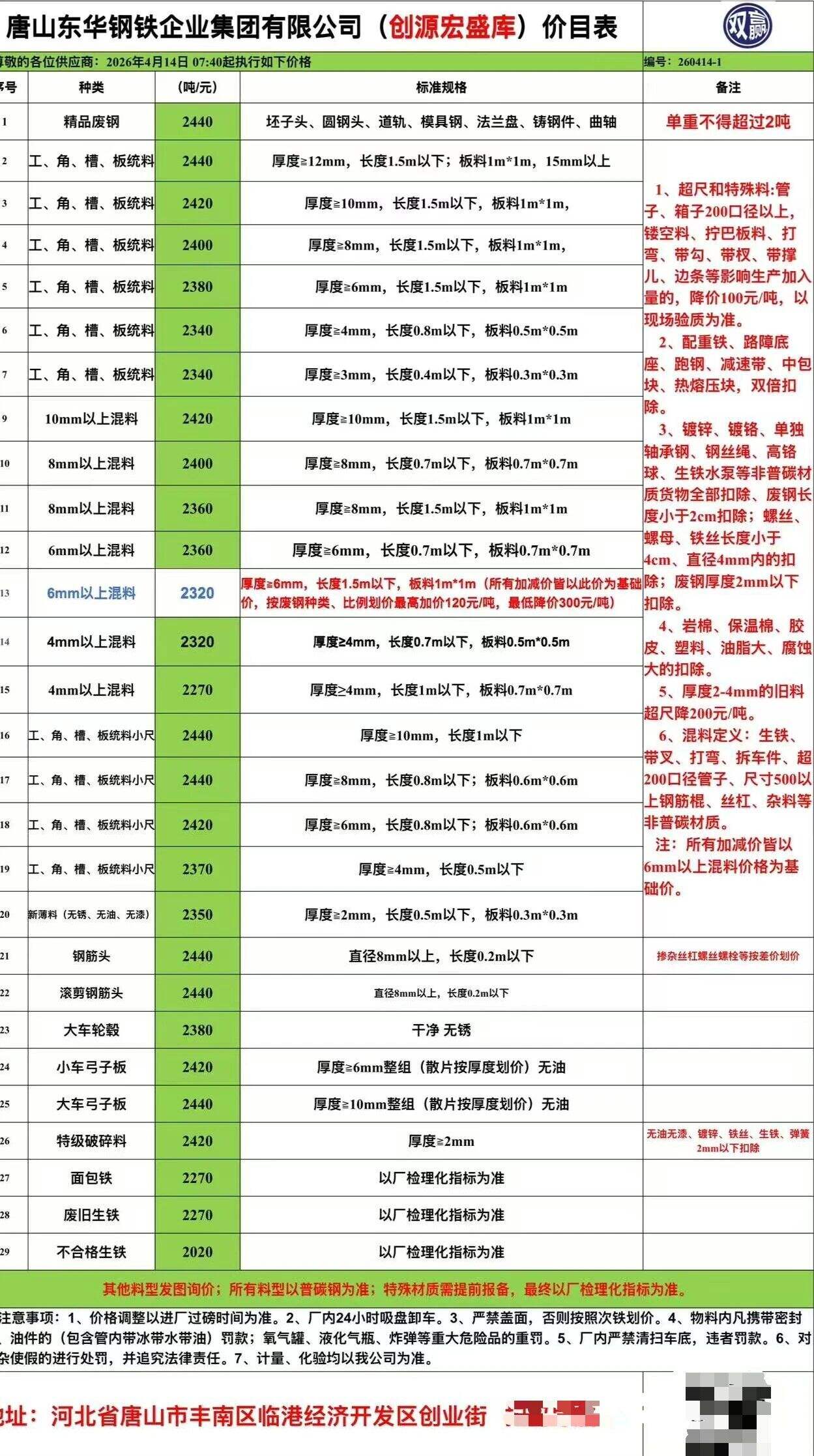 唐山東華鋼鐵(首龍通力庫)地址:唐山市灤州市臺北道首龍通力再生資源。*月**日**:**起,開始收貨,詳見價目表。不限車型、卸車迅速、付款及時,歡迎新老客戶聯(lián)系垂詢、踴躍供貨!